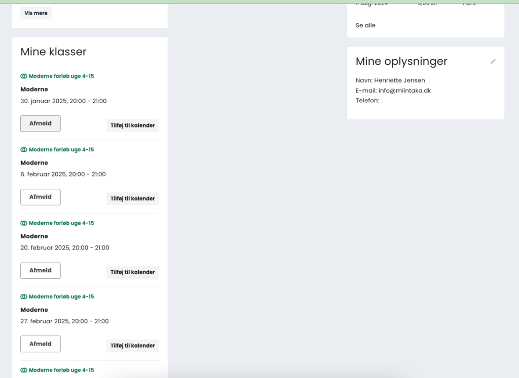 Scroller du længere ned på siden, vil du kunne se det du har tilmeldt dig. Du har mulighed for at afmelde hold, men også føje det til din kalender.