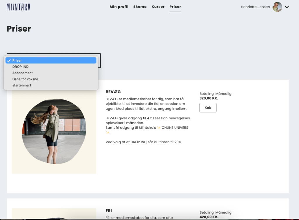 Her er en drop down menu, hvor du nemmere finder de forskellige prisgrupper. Skal du derimod tilmelde dig til en workshop/fordybelses event? Så skal du lede under KURSER, som du også finder i den øverste linie.
